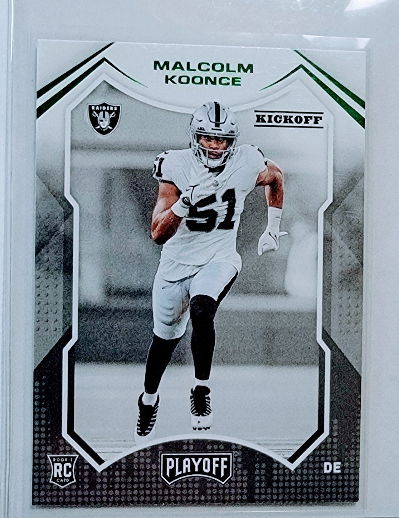 Embrace the start of Malcolm Koonce's NFL career with the 2021 Panini Playoff Green Kickoff Rookie Las Vegas Raiders Football Card. Whether displayed proudly or cherished as a collector's item, this card embodies the essence of Raiders football and the promise of an exciting future.